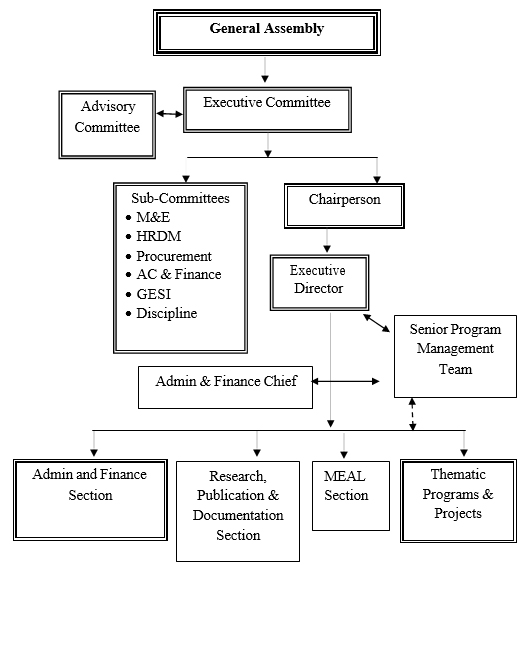 The general assembly (GA) is the supreme body of the organization, which elects the board of executives. The organization is managed by a board of executives elected by general assembly. The board appoints an Executive director (ED) for daily management of the office. The organizational structure is presented as below.